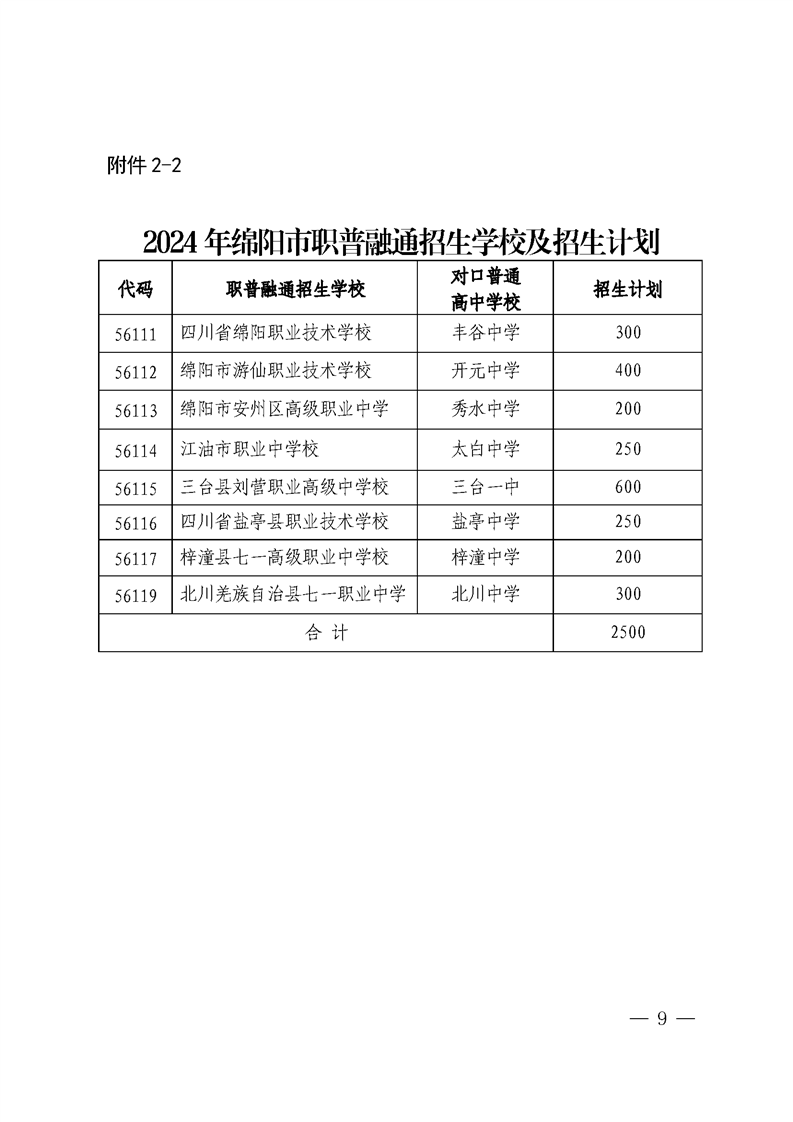 2.各縣市區開設職普融通實驗班,實行單列招生計劃(見附件2-2)、單獨劃線招生,學生填報三年制職普融通志愿,入學就讀中職學校職普融通實驗班,一年后達到普通高中文化考試成績,可按照相應規定轉入對口普通高中學校學習,相關實施辦法依照《綿陽市教育和體育局關于推動普職融通育人模式改革的實施意見》執行。