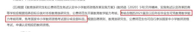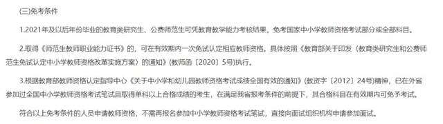 2017年及以前加入國家中小學教師資格考試改革試點省份的高等學校相關師范類專業,自2022年起可以參加免試認定改革(具體名單另行印發)。實施免試認定改革的高等學校應建立師范生教育教學能力考核制度,根據培養目標分類對師范生開展教育教學能力考核,考核合格的2022屆及以后年份畢業生可憑教育教學能力考核結果,免國家中小學教師資格考試,具體公告詳情查看閱讀原文。