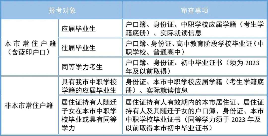 (2)具有本市常住戶籍的普通中專、職業(yè)高中、技工學(xué)校(以下簡稱“中職學(xué)校”)畢業(yè)生、普通高中往屆畢業(yè)生、同等學(xué)力考生;具有本市中職學(xué)校正式學(xué)籍的應(yīng)屆畢業(yè)生;在本市中職學(xué)校畢業(yè)或具有同等學(xué)力的本市居住證持有人隨遷子女。