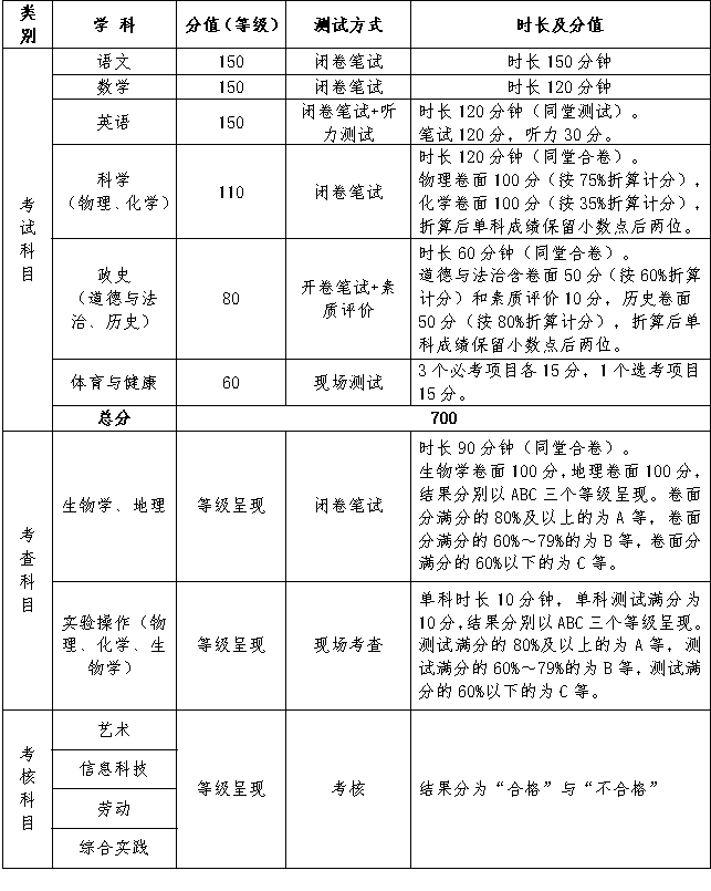 綿陽這份關于中考改革的征求意見稿,中考計分科目取消了生物、地理、實驗操作,降低了物理、化學、體育的總分,中考總分從900分降為700分,高中招生錄取的科目只有:語文、數(shù)學、英語、政史、科學、體育與健康。