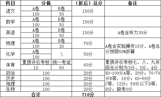 成都中考目前還沒有調整“小四門”的相關政策,目前中考計分科目共10門(語文、數(shù)學、英語、物理、化學、道德與法治、歷史、生物、地理、體育),總分為710分。
