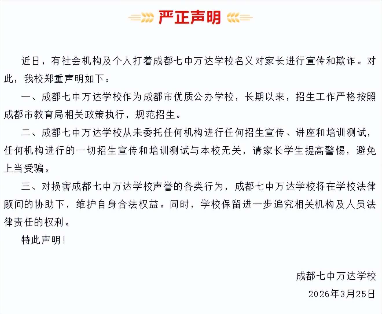 成都七中萬達學校發布的聲明中提到,該校從未委托任何機構進行任何招生宣傳、講座和培訓測試,任何機構進行的一切招生宣傳和培訓測試與本校無關,請家長學生提高警惕,避免上當受騙。