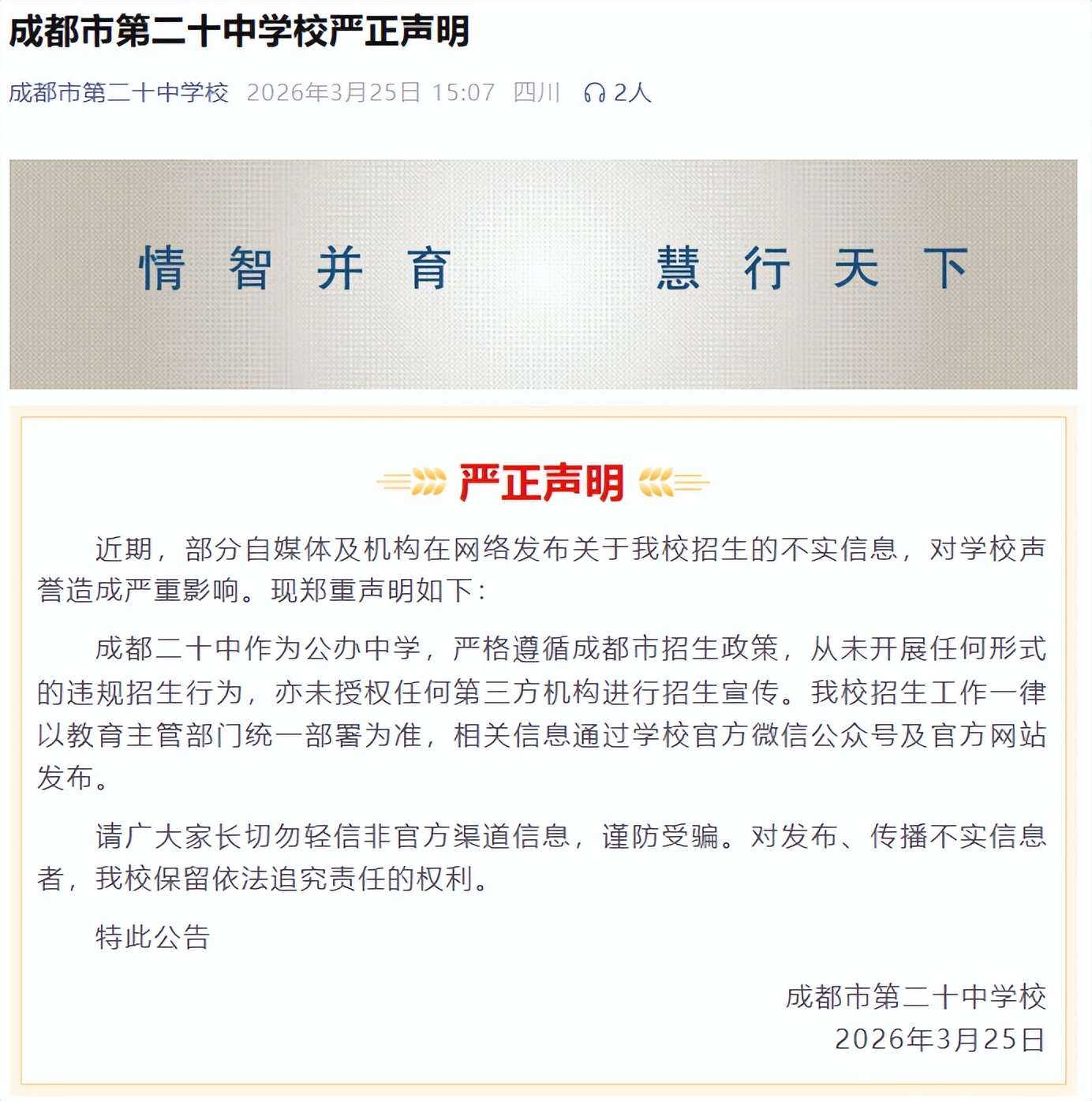 成都市第二十中學校在嚴正聲明中提到,從未開展任何形式的違規招生行為,亦未授權任何第三方機構進行招生宣傳。