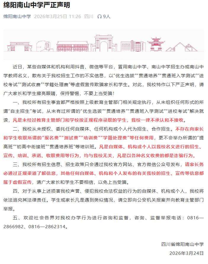 此外,綿陽南山中學的聲明中也提到,近日,某些自媒體和機構利用抖音、微信等平臺,冒用南山中學、南山中學招生辦或南山中學教師名義,散布關于該校招生工作的不實信息,以虛假宣傳欺騙家長和學生。校方表示,該校從未授權、委托任何自媒體、任何機構或個人代為招生、合作招生。不存在向家長和學生收取所謂的“報名費”“測試費”“培訓費”“學籍處理費”等任何費用,更不會舉辦所謂的“提高班”“初高中銜接班”“貫通培養班”等培訓班。并且,學校提醒家長,凡是自媒體、機構或個人以該校名義進行的招生、宣傳、培訓、承諾、收取費用等行為,均與學校無關,凡是以各種名義收費的都是詐騙行為。