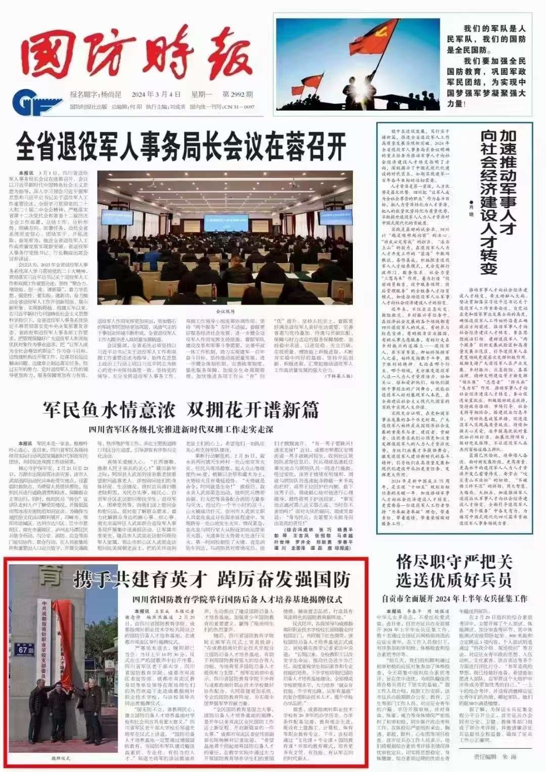2024年1月,學校與南充電子工業學校正式建立戰略合作,成為成都市唯一一所國防后備人才培養基地。