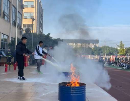 隨后,消防救援大隊(duì)教官講解了干粉滅火器的使用方法,并進(jìn)行了現(xiàn)場(chǎng)演示。演示完后,邀請(qǐng)各班級(jí)代表進(jìn)行了實(shí)操練習(xí)。“提、拔、握、壓”的使用步驟被全體師生牢牢記住。