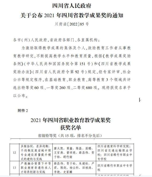 在四川省人民政府關于公布 2021 年四川省教學成果獎的通知( 川府函〔 2022〕85號文件 )中,四川省綿竹市職業中專學校收獲喜訊,成為四川省唯一獲得兩項教學成果特等獎的中職學校。
