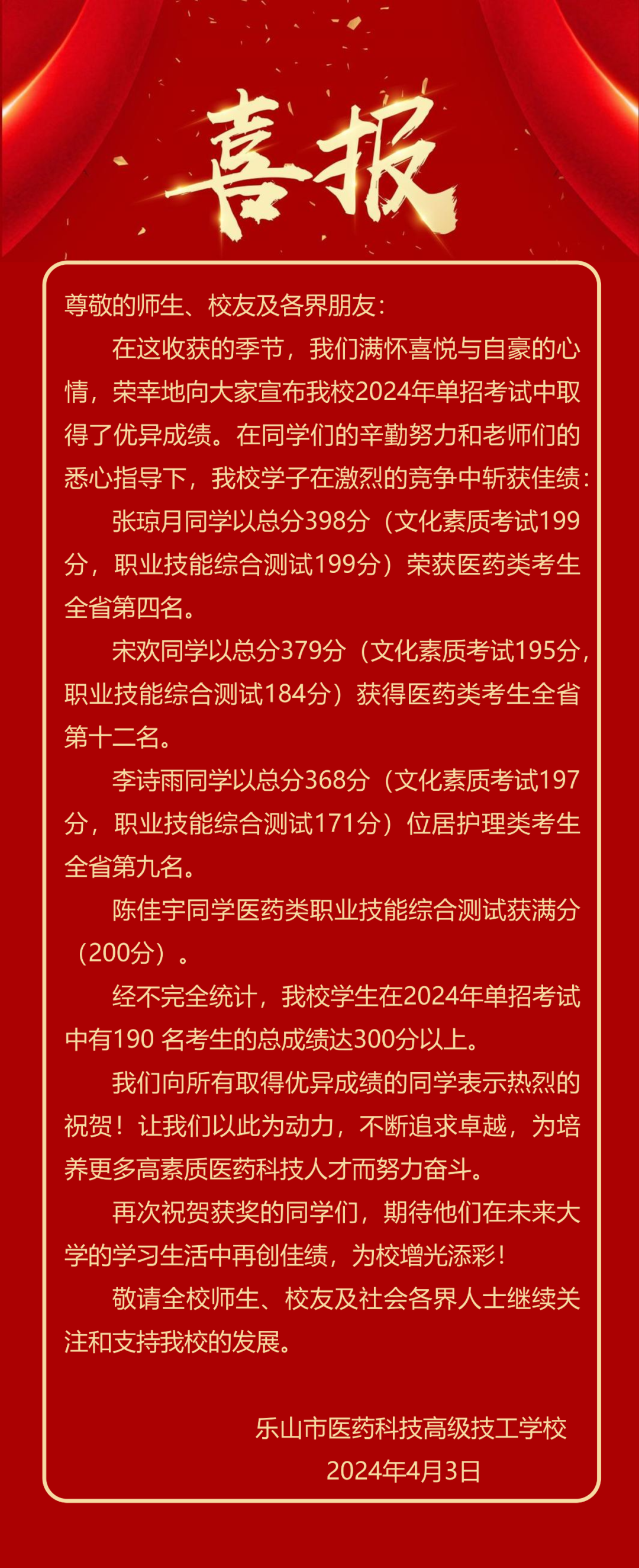 樂山市醫藥科技高級技工學校2024年單招考試喜報