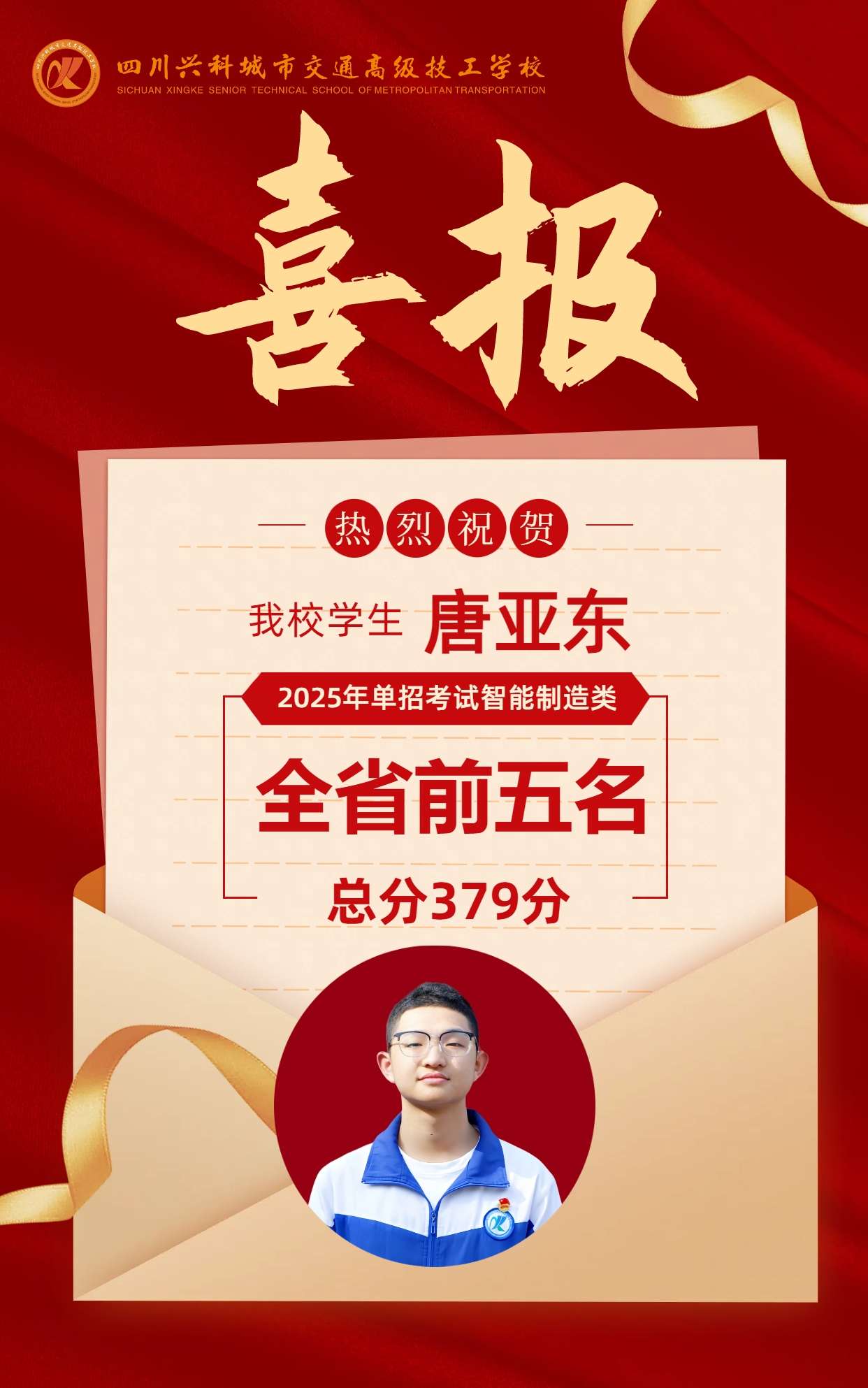 在2025年高職單招考試中,我校學子陶建熊以389分榮獲智能制造類全省前三名、唐亞東以379分榮獲智能制造類全省前五名、蔣鑫榮以370分榮獲智能制造類全省十三名、陳鑫以388分榮獲醫藥類全省十三名。